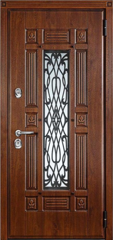 Дизайнерская входная дверь в частный дом с отделкой под дерево и решеткой №17